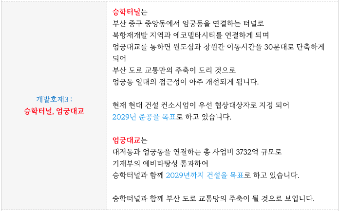 - 승학터널, 엄궁대교 : 부산원도심 접근 개선, 시외 접근 개선. (2029년 완공 목표 ).