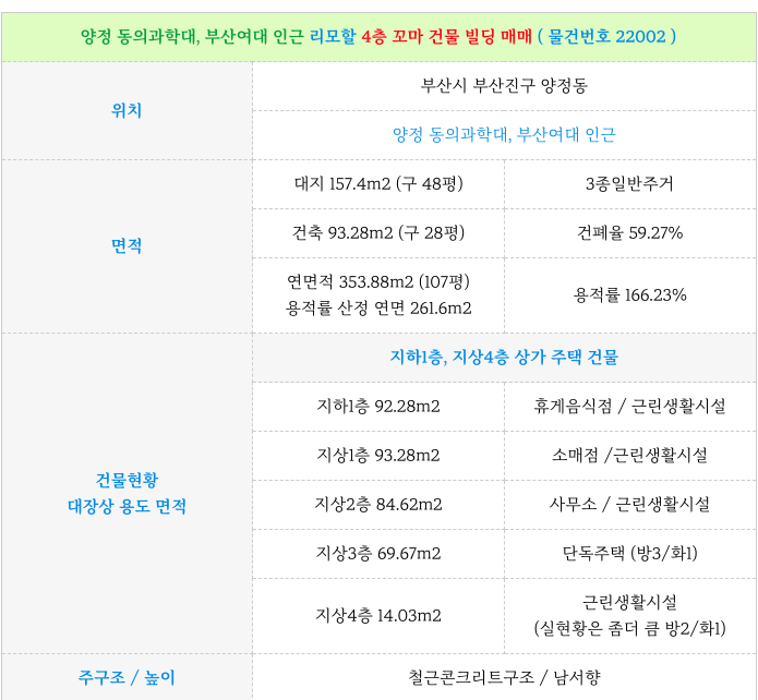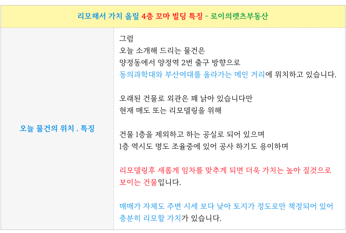 부산 양정동 동의과학대, 부산여대 리모해서 가치 올릴 4층 꼬마 상가 건물 빌딩 매물