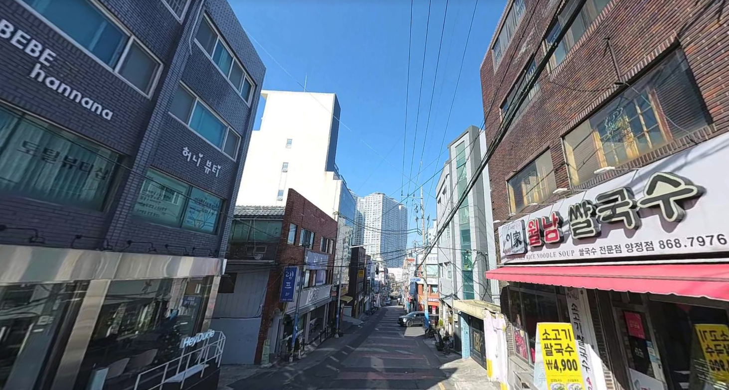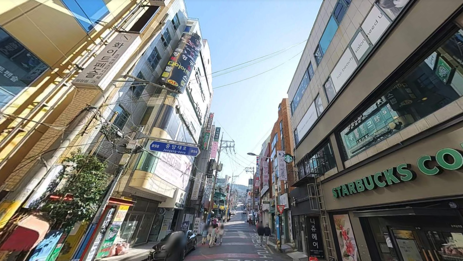 중앙대로 스타벅스 건물을 기점으로 해당 중심 거리와 그 양옆으로 다양한 상권이 혼재되어 있습니다.