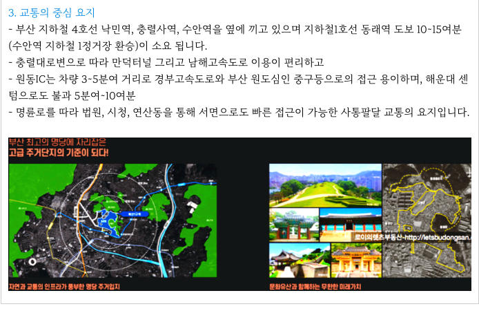 대충교통으로 부산 지하철 4호선 낙민역을 품고, 1호선 동래역은 2정거장 환승 가능하며