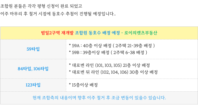범일2구역 조합원 분들의 동호수 배정 부분 정리하였으니 보시고 뒤이어 타입별 세대수도 소개드립니다.