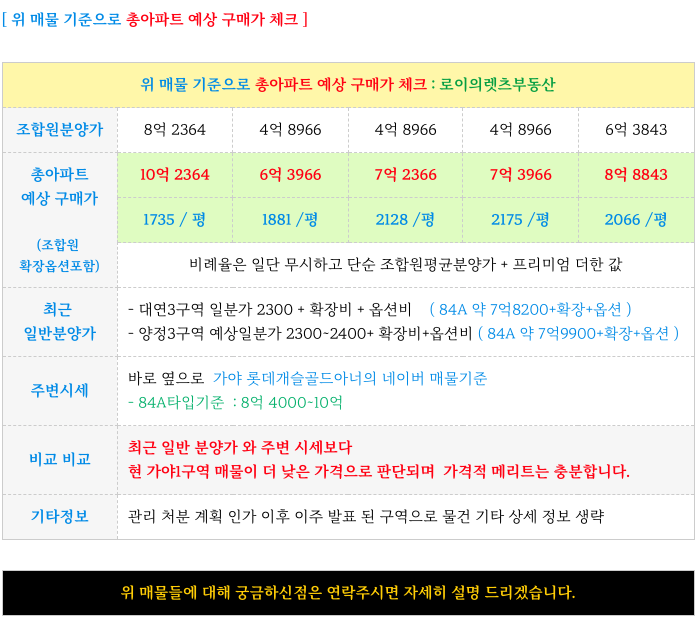 * 현재 조합원 분양가 대입하여 총 아파트 매수가 역시 체크하여 아래 소개 드립니다.