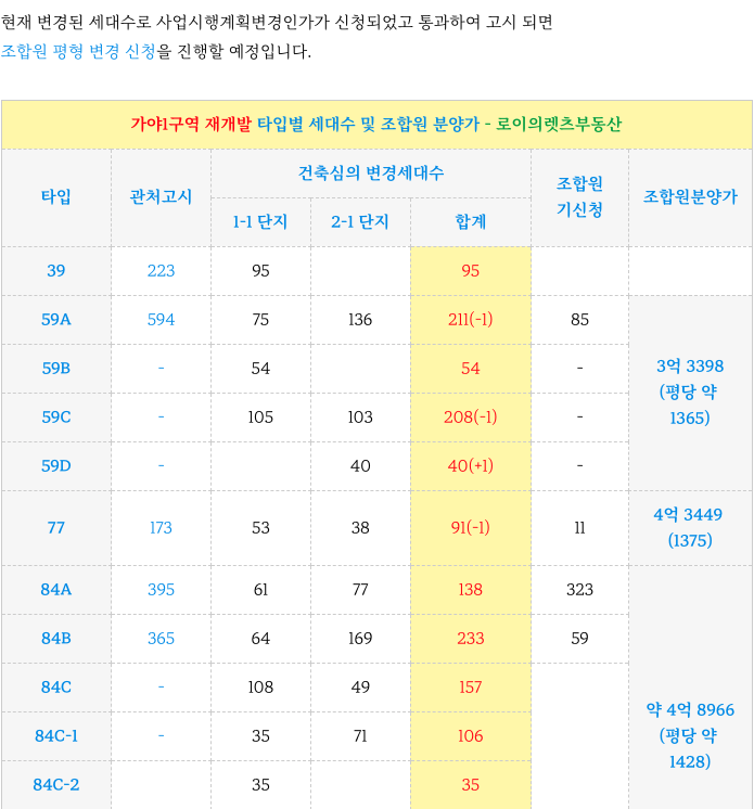 가야1구역 타입별 세대수 정리하였습니다.