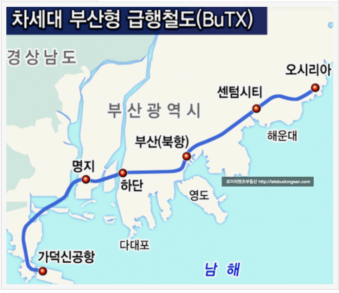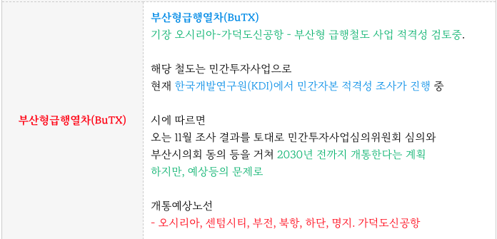 4) 부산형급행열차(BuTX)는 2025년 하반기 착공을 목표로 지하 대심도로 가덕신공항, 하단역, 북항, 부전역, 오시리아로 연결되며 현재 KDI 민자 적격성 조사를 진행중에 있습니다.