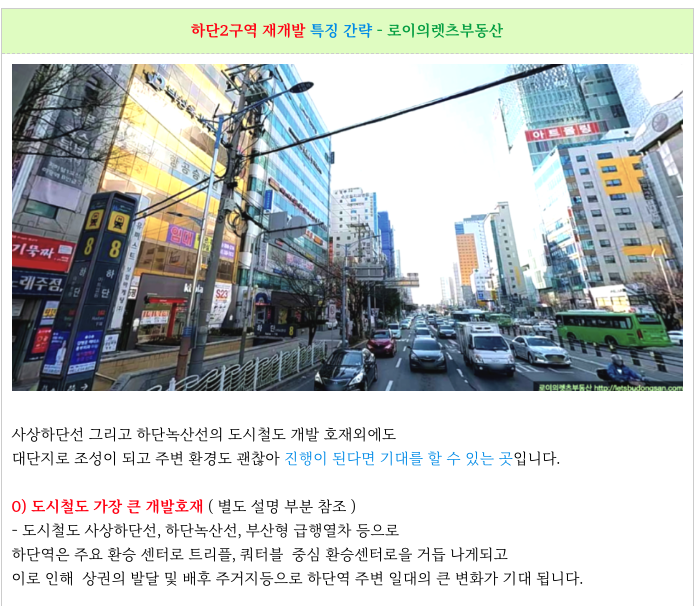 하단역 도보 5분의 역세권의 장점을 가진 재개발 구역 입니다.