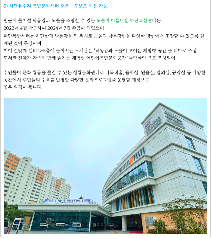 - 괴정생태하천, 하단유수지 문화센터, 을숙도 생태공원, 낙동강