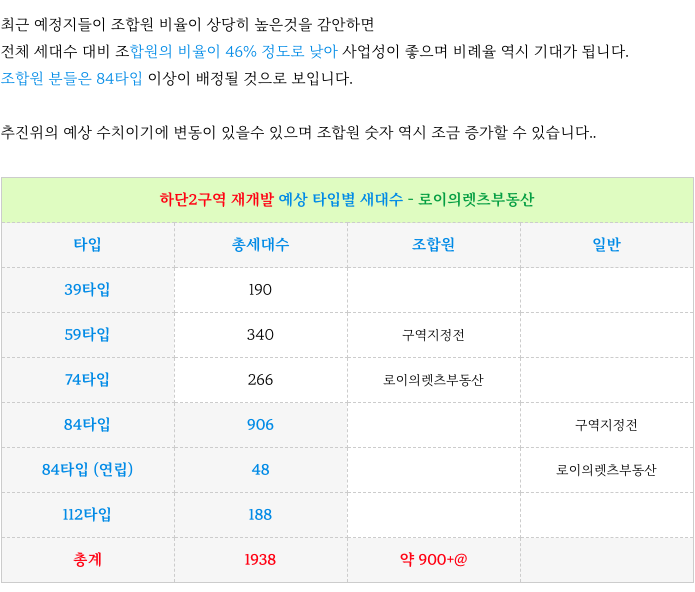 하단2구역 재개발 현재 계획 타입별 세대수 정리하였습니다.