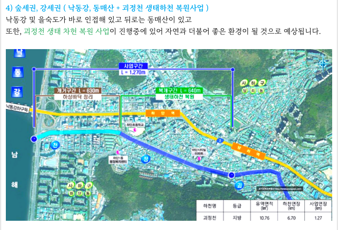 바로 인근으로 낙동강을 곁에 있는 것은 물론 이어진 괴정천은 생태하천으로 복원 중에 있으며