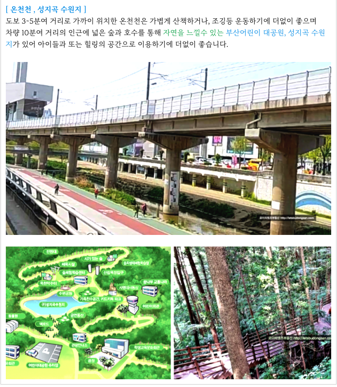 부산 시민이 사랑하는 온천천이 도보 3분여 거리에 있어 산책, 휴식 운동하기도에도 좋은