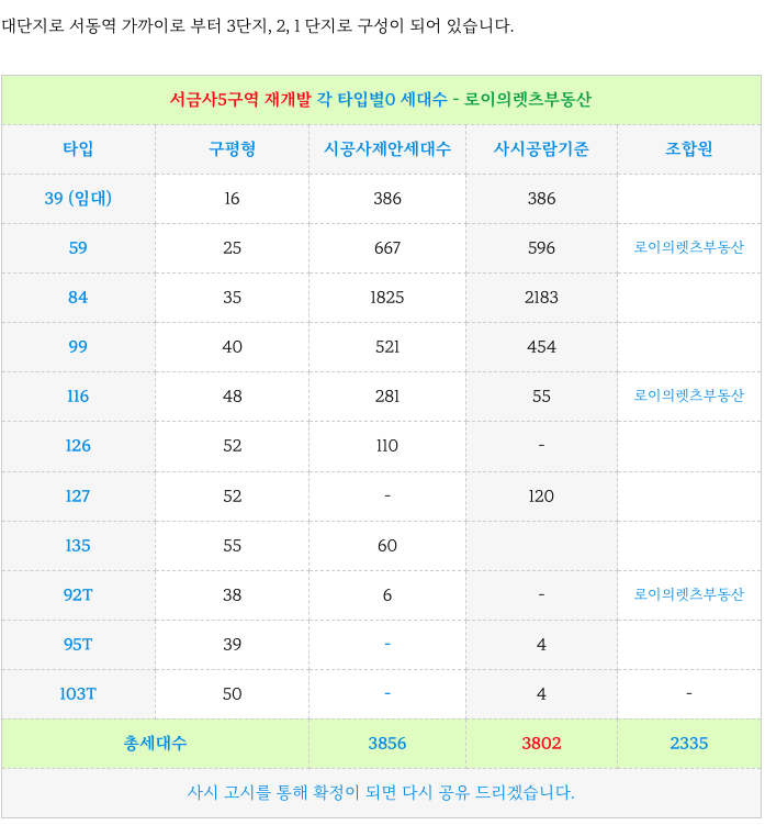 사금사5구역 재개발 계획된 타입별 세대수 정리하였습니다.