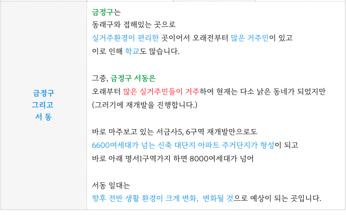 서금사5구역 설명드린 주요 입지 특징 간략히 다시 정리하였습니다.