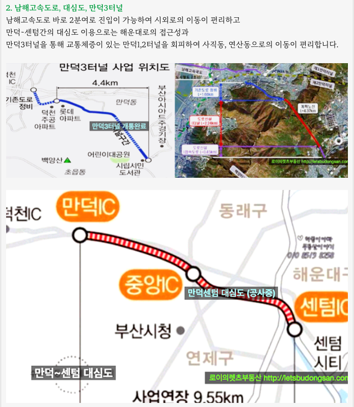 그리고 공사중인 센텀,만덕 대심도를 통해 수영, 해운대로의 접근도 크게 개선이 될 예정입니다.