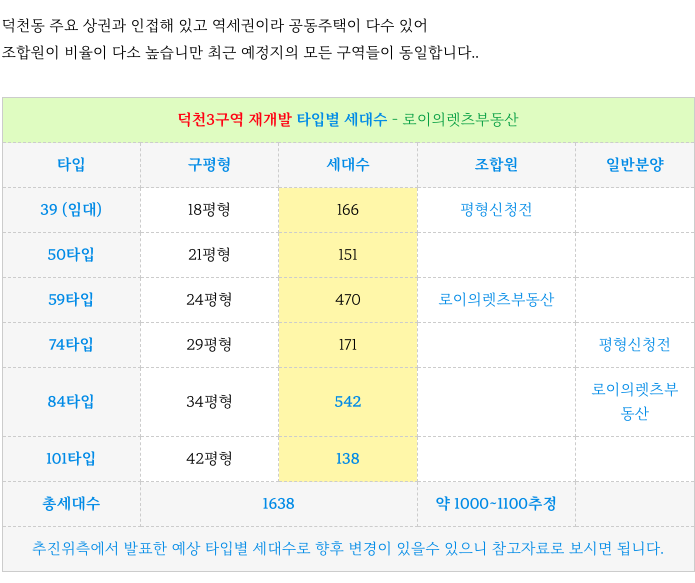 덕천3구역 재개발 현재 계획된 타입별 세대수 입니다.