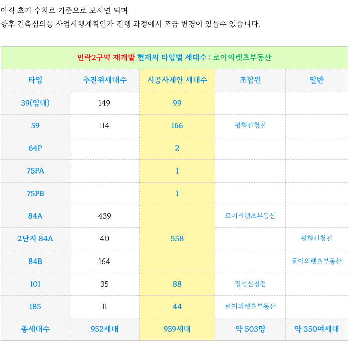 전체 세대수 대비 조합원 수를 감안하면 조합원 분들은 84타입 이상 배정이 가능해 보입니다.