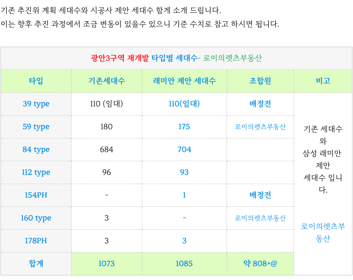 수영구 광안3구역 재개발 현재 계획 타입별 세대수 소개해 드리겠습니다.