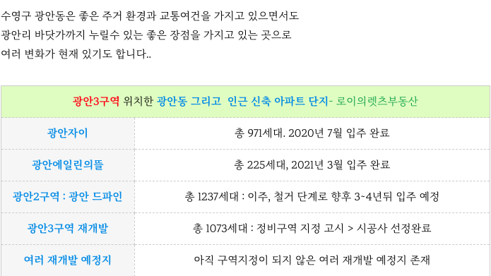 - 수영구 중심 광안역 준 역세권, 우수한 실거주 환경, 높은 시세
