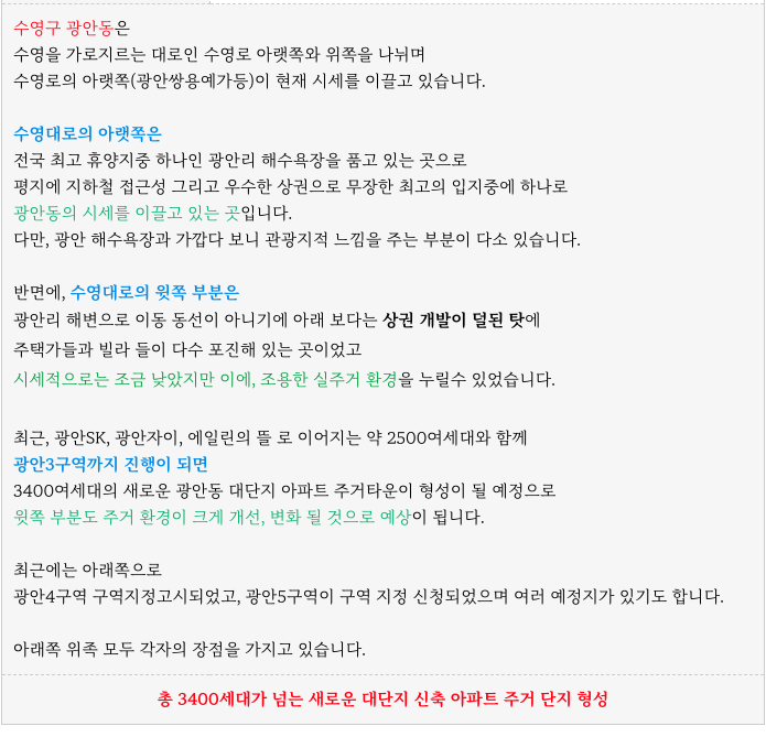 광안3구역 재개발이 위치한 수영 광안동 현재 주요 변화 부분을 간략 정리하였습니다.