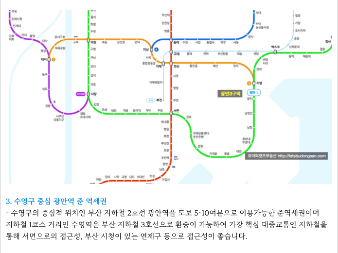 도보 5~7분여의 부산 지하철 2호선 광안역의 역세권이 될 예정입니다.