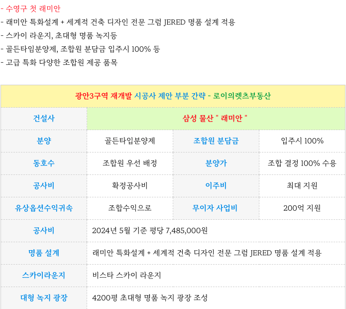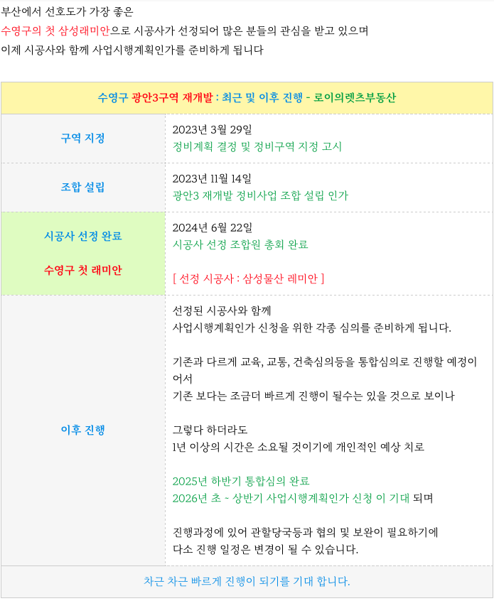 광안3구역 재개발 은 6월 22일 시공사 삼성 시공사 선정을 완료하였습니다.