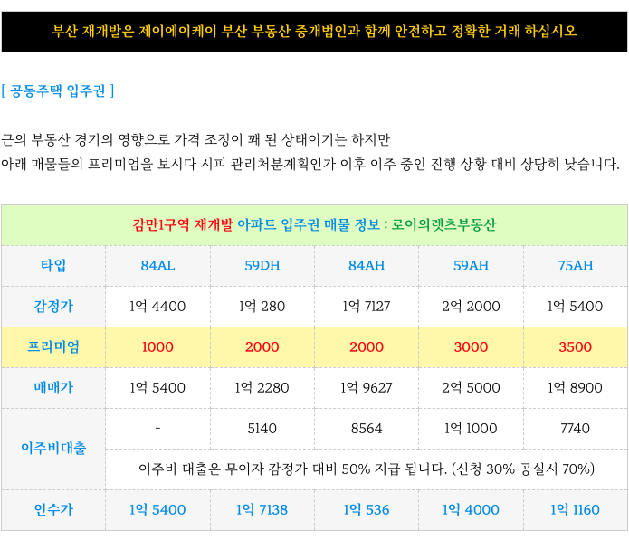 감만1구역 최저 소액 타입별 매물들 소개해 드리겠습니다.
