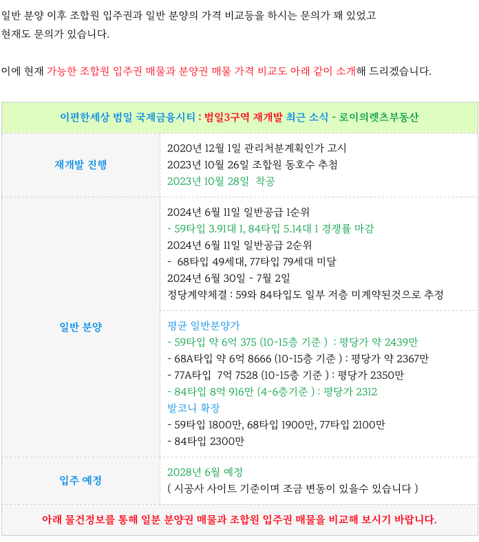 범일3구역 현 매수 가능한 조합원 입주권 매물과 분양권 매물 가격 비교 소개 드립니다.