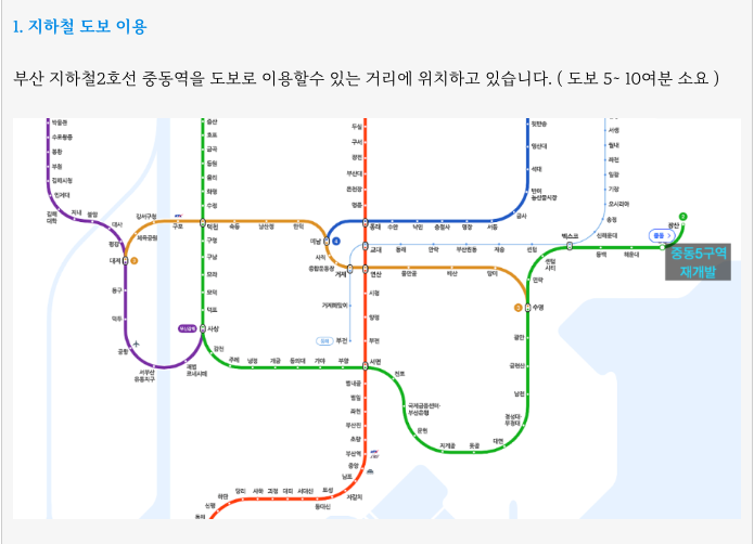 부산 지하철 2호선 중동역 도보 5~10여분 정도의 역세권으로