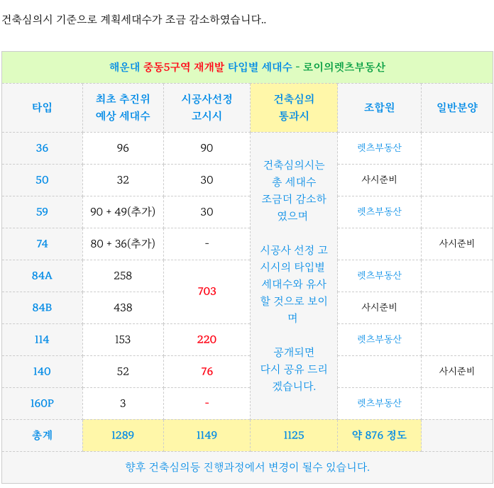 중동5구역 재개발 현재 타입별 세대수 소개해 드립니다.