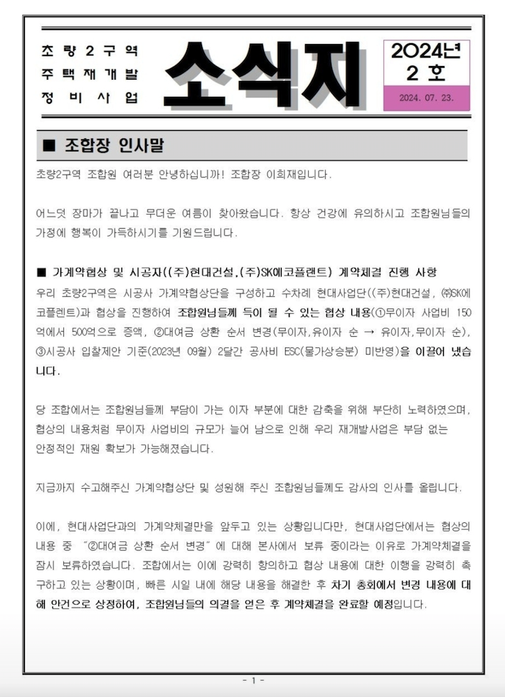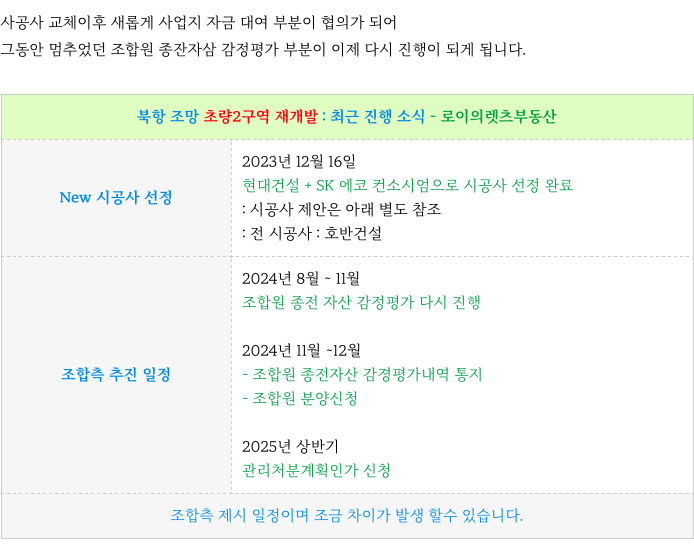 선정된 시공사와 협의 과정을 거쳤으며 이제 새롭게 정상화 하여 진행중에 있습니다.
