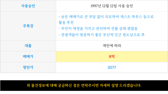 - 낮은 매매가로 큰 부담 없이 리모하여 게스트 하우스, 모텔 등으로 활용 추천