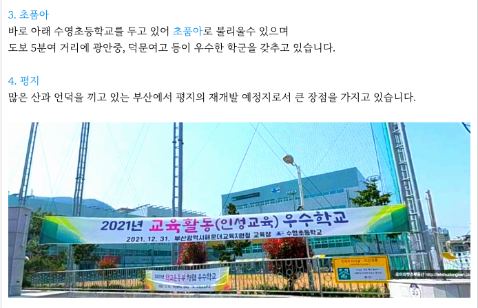 - 더블역세권, 수영구, 평지, 초품아, 교통적으로 우수,