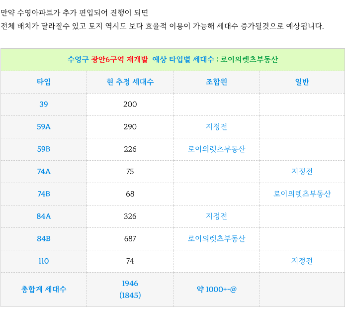 광안6구역 추진위 추정 타입별 세대수 소개해 드립니다.