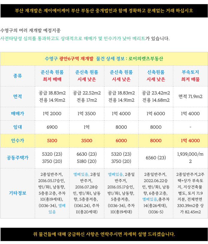 광안6구역 재개발 소액, 가성비 좋은 소액 매물 정리해 드리겠습니다.