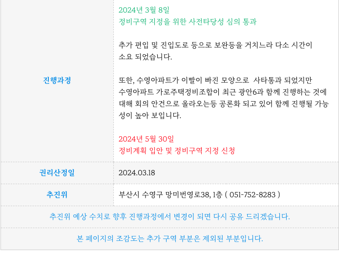 광안6구역 주요 진행 사항 그리고 이후 일정 정리등 추가 정보는 아래 페이지를 참고 부탁드립니다.