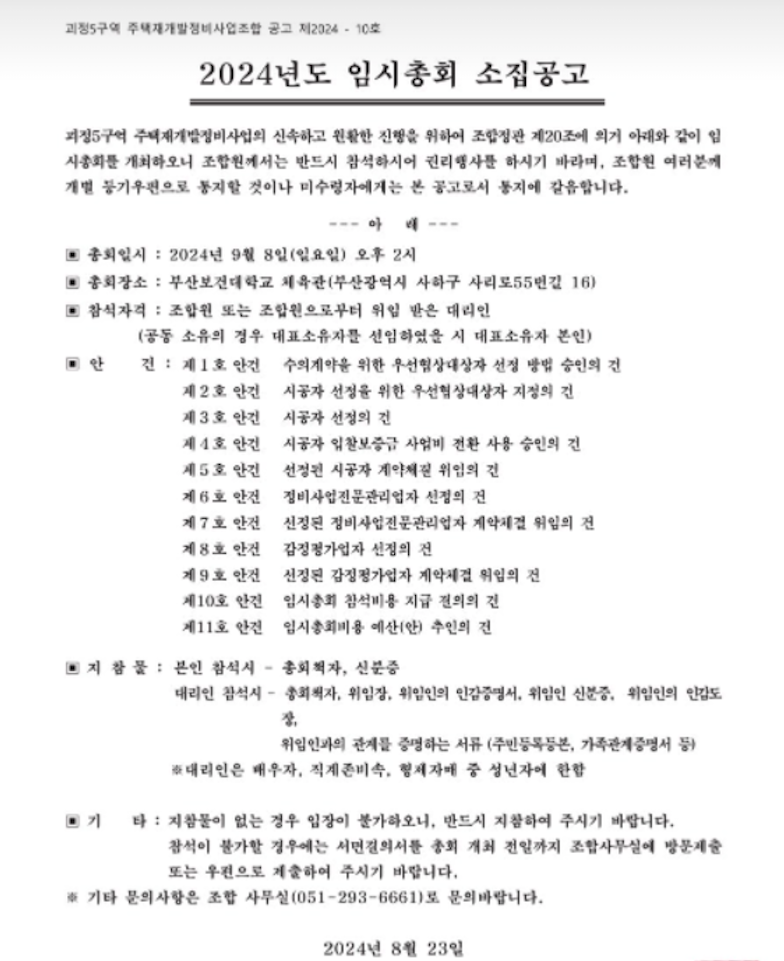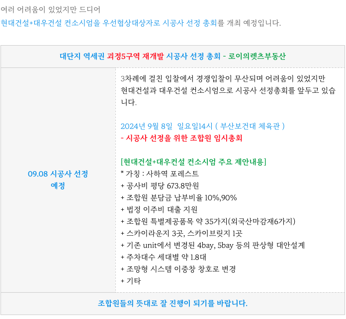 사하 대장주 괴정5구역 은 9월 8일 시공사 선정 총회를 앞두고 있습니다.