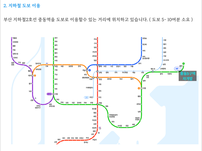 부산 지하철 2호선 중동역 도보 5~10여분의 역세권이며