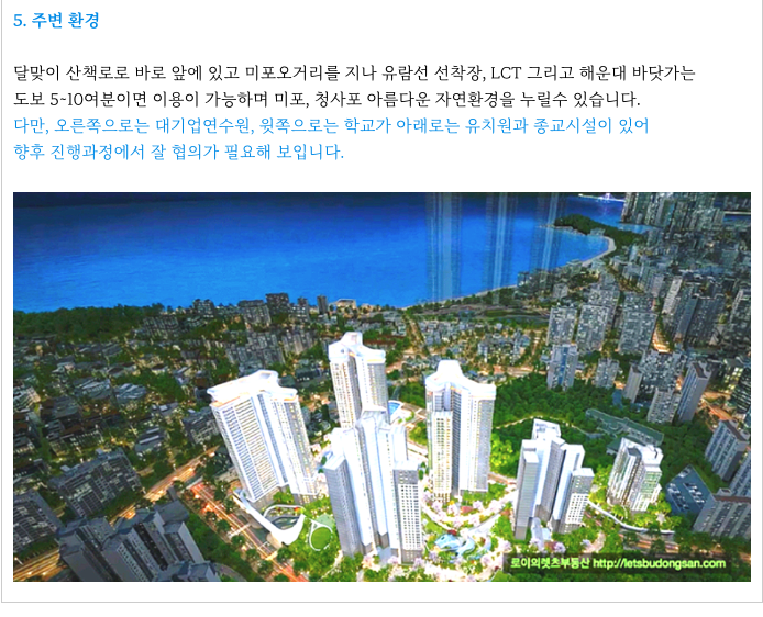 도보 해운대 바닷가 이용, 달맞이 언덕 등 타고난 입지로 큰 기대를 할수 밖에 없는 곳입니다.
