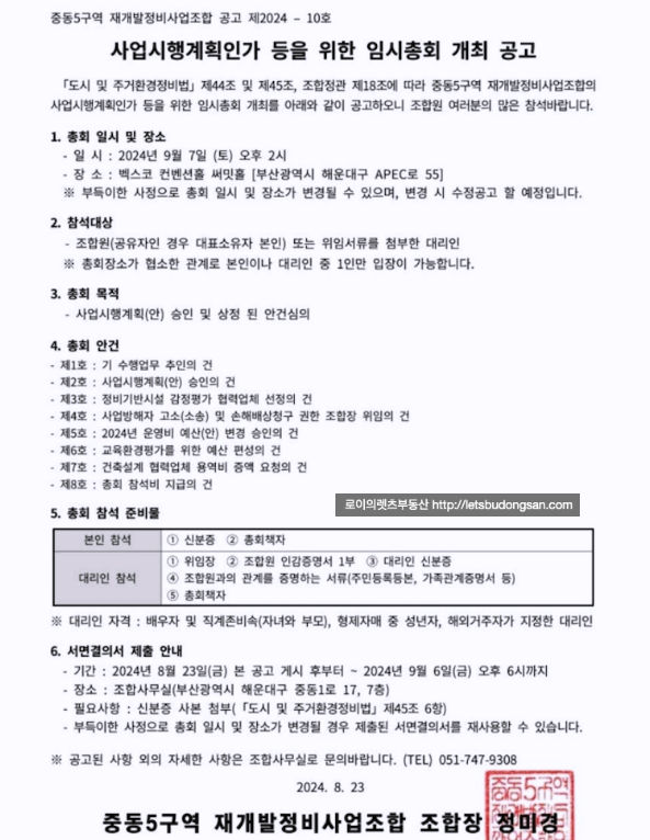중동5구역은 9월 7일 사업시행계획인가를 위한 총회를 개최하였습니다.