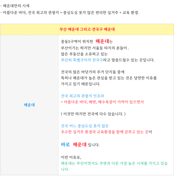 [ 가장 큰 장점 다시 정리하면 : 아름다운 바닷가와 좋은 실거주 ]