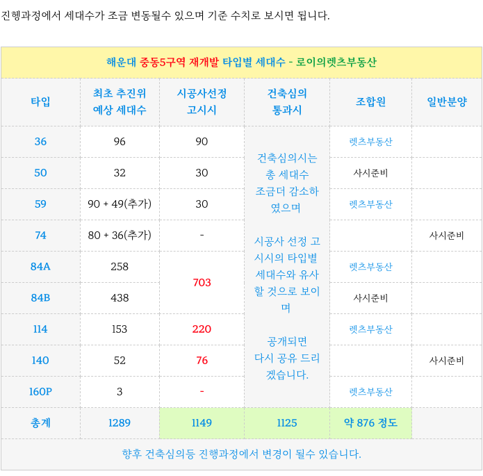 중동5구역 재개발 타입별 세대수 ( 건축심의 기준 ) 정리 드립니다.