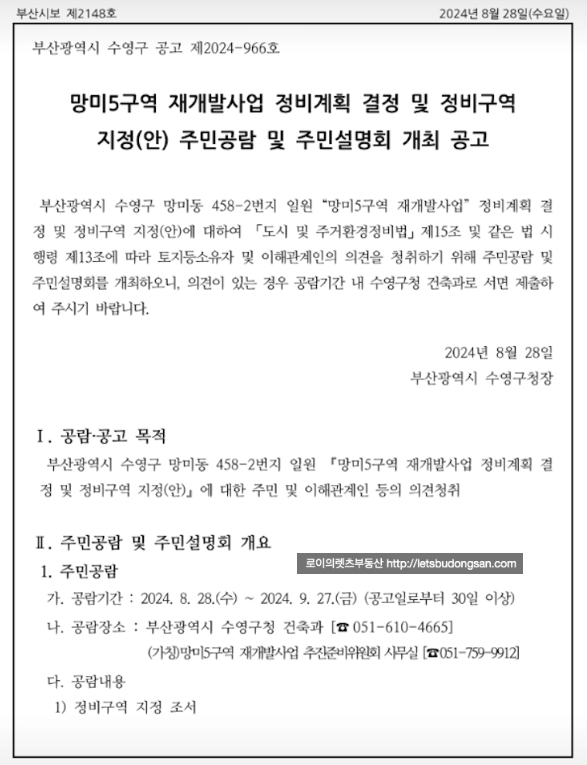 수영구 망미5구역 은 구역 지정을 앞두고 구역 지정 공람공고를 진행중에 있습니다.