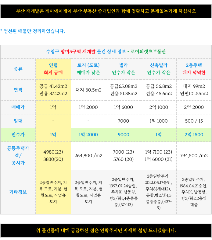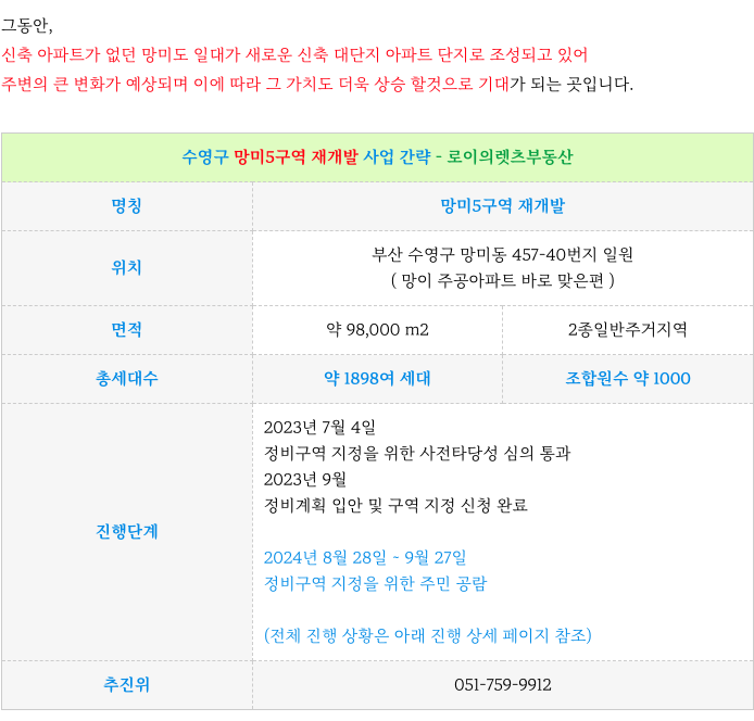 부산 전역 재개발에 대해 궁금하신 사항은 방문 또는 연락 주시면 자세히 설명 드리겠습니다.