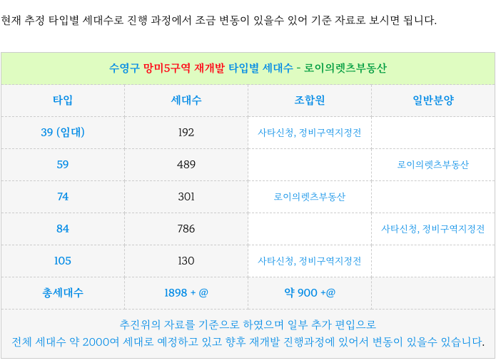 망미5구역 재개발 현 예상 타입별 세대수 입니다.