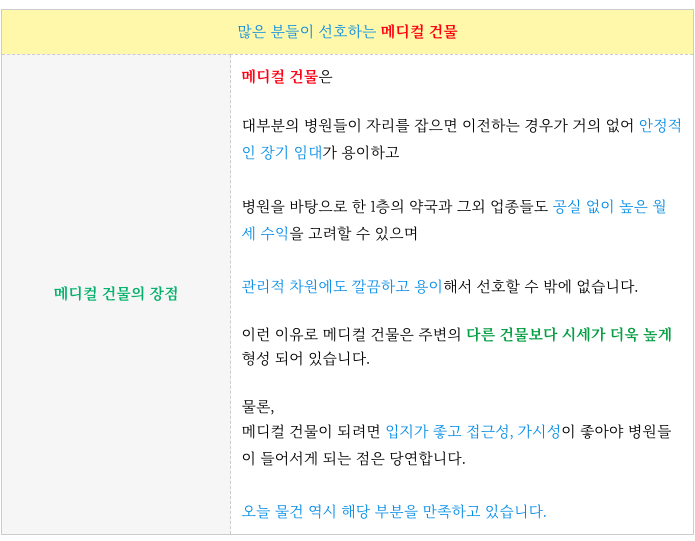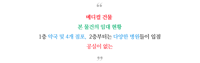 메디컬 건물은 관리의 용이성과 장기임차로 인한 안정적 월 수익으로 건물의 가치가 높습니다.