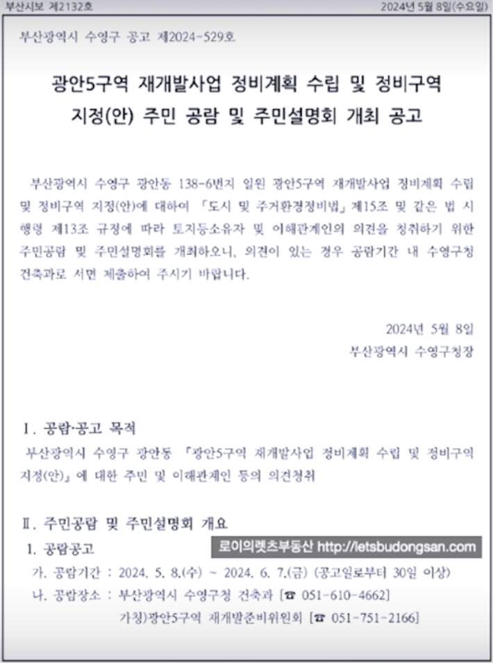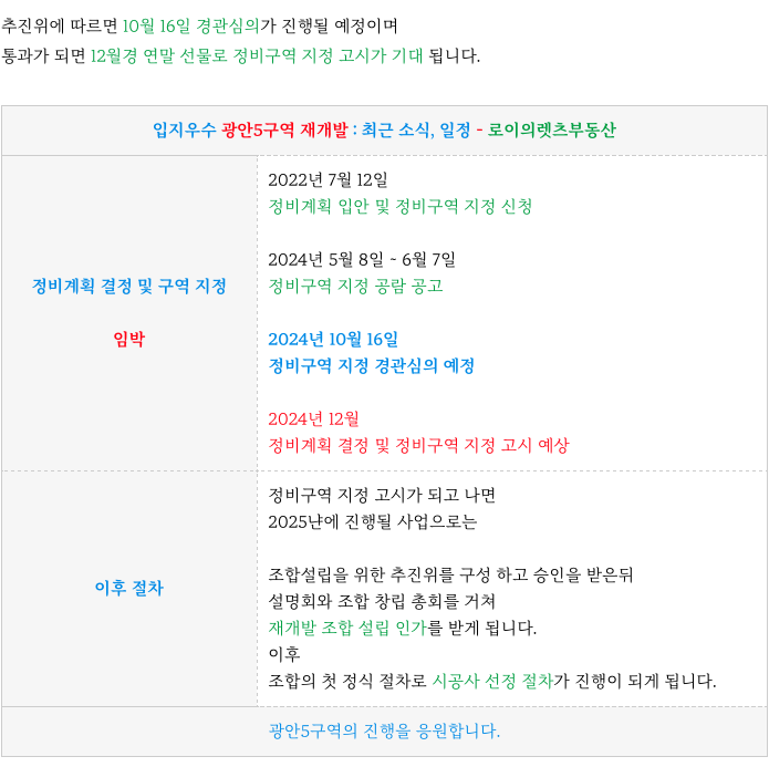 광안5구역 재개발 현재까지 주요 일자별 진행 사항과 향후 절차 정리등 추가 정보는 아래 페이지를 참고 부탁드립니다.