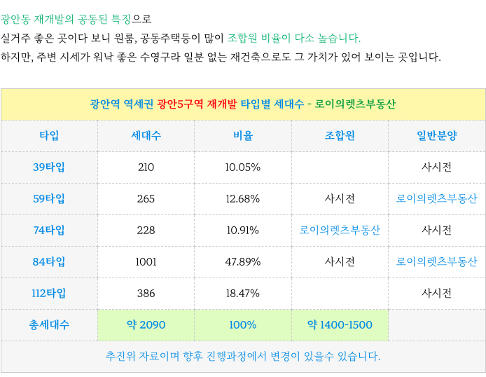 광안5구역 재개발 추진위 추정 각 타입별 세대수 소개해 드립니다.