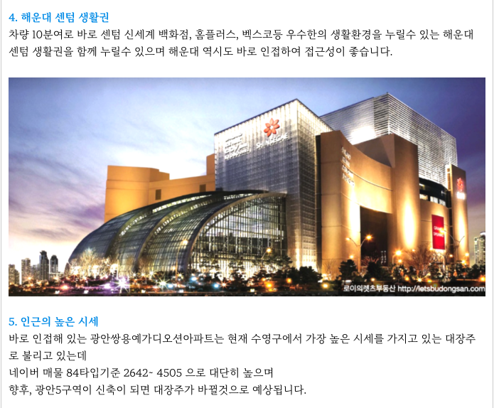 신세계백화점, 롯데백화점, 부산시립미술관, 영화의전당, 벡스코 등 센텀의 문화, 상권의 이용이 좋으며