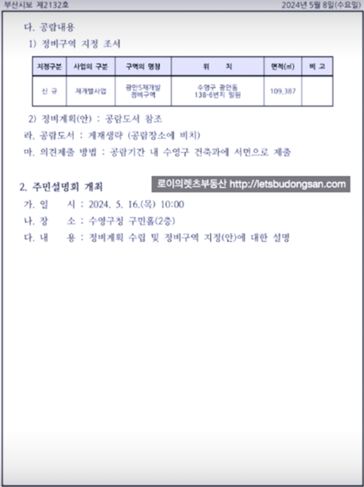 | (래미안 수영 더 퍼스트) 광안3구역 재개발 : 현 매물 & 일정, 소식 (1) | 2024.09.21 |