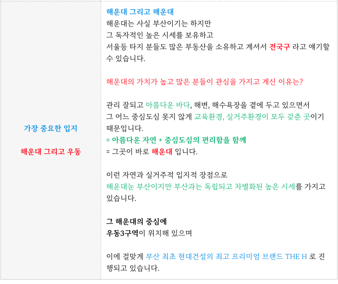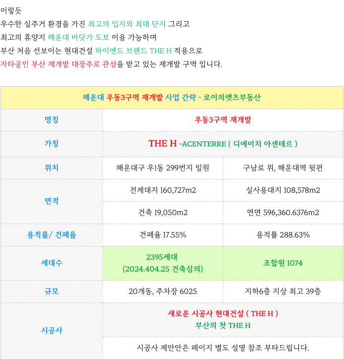 부산의 특구 해운대 중심에 위치하여 부산 재개발 대장주로 꼽히며 관심을 받고 있습니다