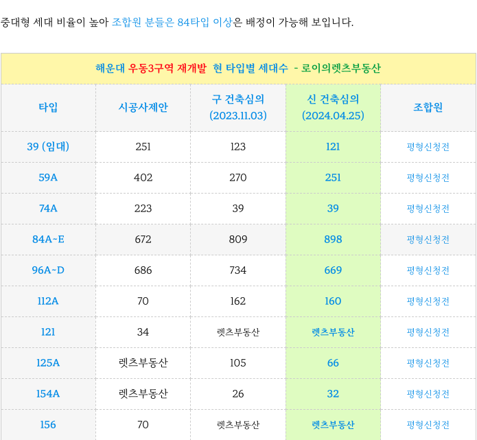 해운대 우동3구역 현 타입별 세대수 소개해 드리겠습니다.