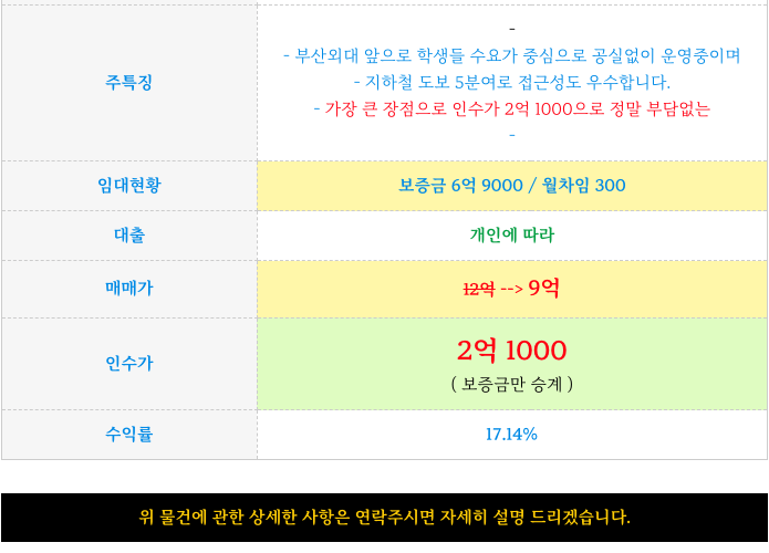- 부산외대 앞으로 학생들 수요가 중심으로 공실없이 운영중이며